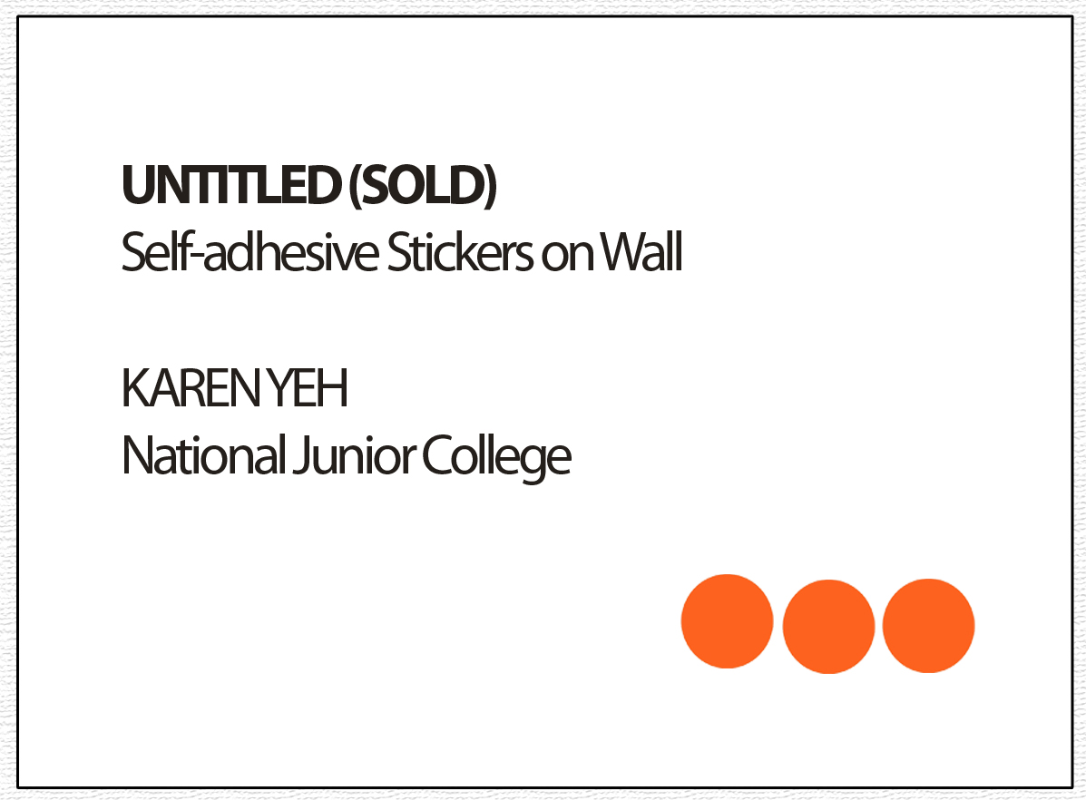 Untitled (Sold) is a quiet, surreptitious intervention piece into the space of the exhibition. Taking its form as orange adhesive dots that one may find on labels next to artworks at gallery exhibitions or art fairs, they are an indication of interested buyers or a declaration of the work having been sold.