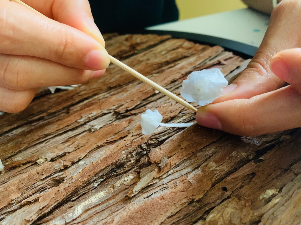 Sophia is affected by the transient nature of life and beauty. Plastic attracted Sophia’s attention: flexible and malleable, but slow to biodegrade – an alternative expression of eternity. Through rounds of exploration and experiments, she used a combination of recycled plastic bags and natural materials to express her idea of making the beauty of nature everlasting.