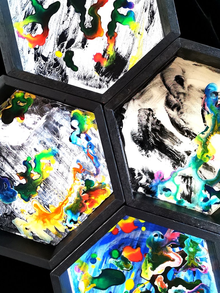 This work is a dedication to Wang Mo’s childhood intrigue on the mysteries and beauty of nature. Imaginary surreal landscapes are created in the honeycombs, inviting us to investigate an imaginary microscopic world within. The worlds are created by materials naturally colliding and reacting to one another, forming lakes, valleys, green patches, white clouds and many more.