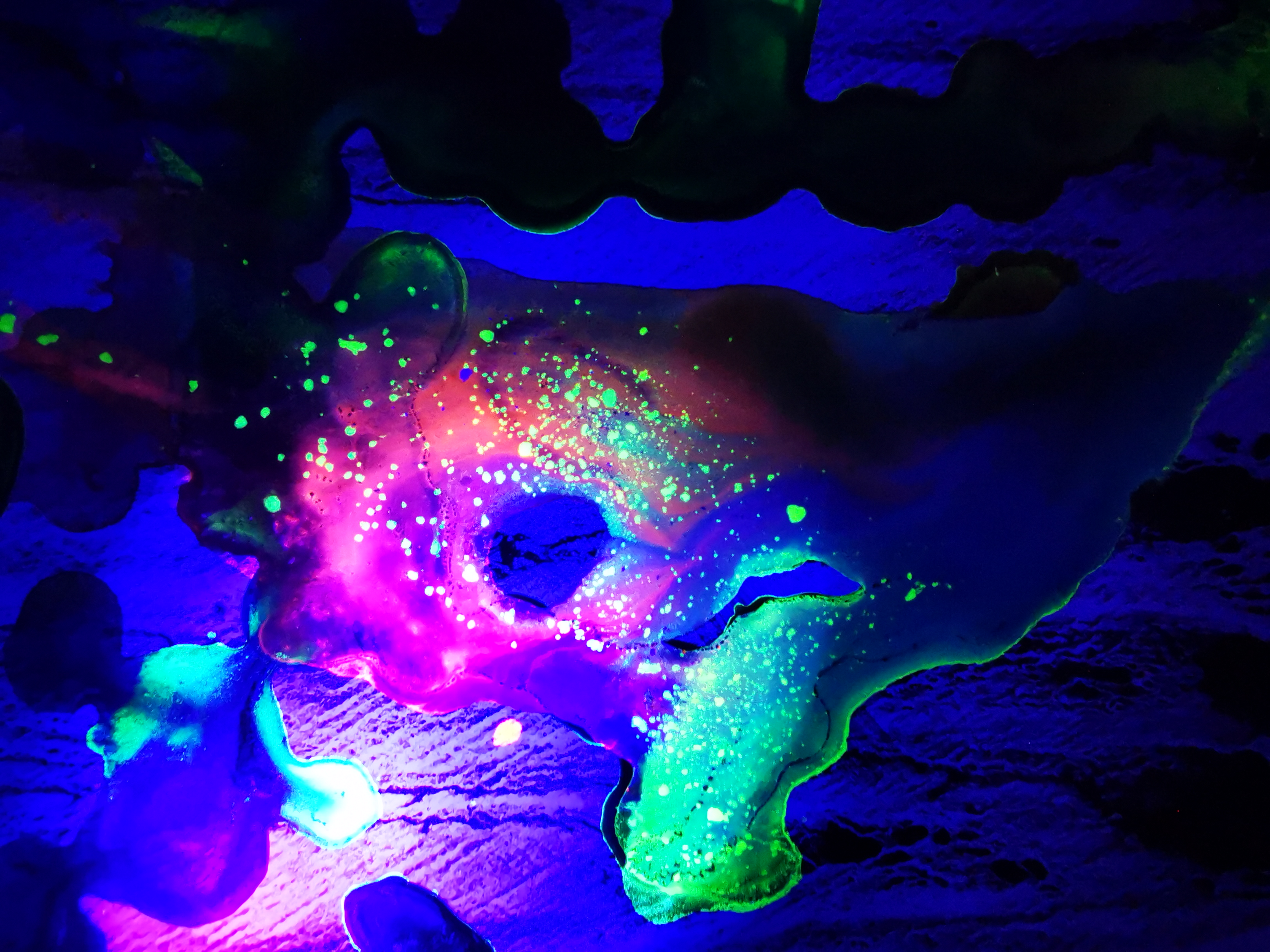 The discovery of the illuminating effect of UV light on certain paints came as a surprise. A friend of mine was playing with a UV torch and shone it at my unfinished work, and what we saw under the UV light intrigued us both. Being an artist, I naturally embraced it and built on it. I prefer painting to be a ‘raw’ process, allowing the paint to flow naturally and produce unique colour combinations. I find the art making process more exciting than final product – the most intriguing moments usually happen during the making – but both parts are equally important in uncovering the chemistry between colours. As I am trained since young in Chinese Ink and Wash painting, or xieyi (writing the idea in visual form) painting, I am more concerned with capturing the essence of subject matters and the atmospheric representation of ideas, rather than a meticulous figurative portrayal. The Other. World / 别有。洞天 has traces of reference to the Chinese landscape painting motifs of mountains and clouds, but I hope to leave it open to the viewer’s interpretation in accordance to his/her personal encounter with nature. I hope that through my work, people can recognise, appreciate and respect the wonders of the natural world in flux.