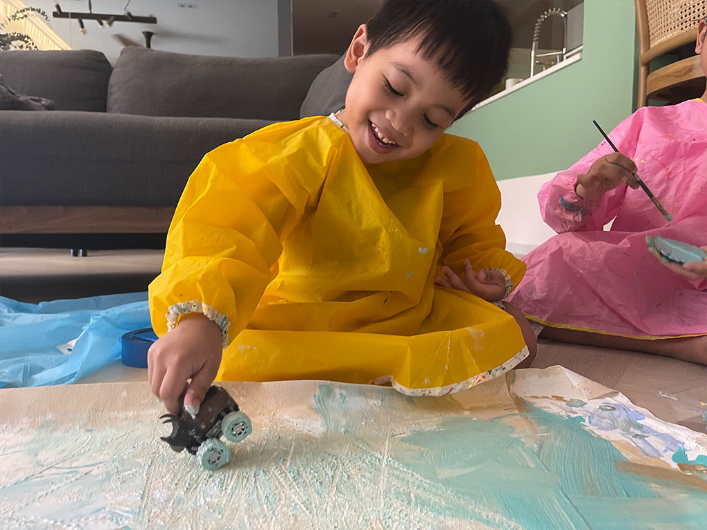 She finds joy in capturing spontaneous brushstrokes and lines, seeing some as mistakes or accidental marks which in return adds beauty to the artwork. Becoming a mother has been a whole different journey and experience all together, but getting her daughter to contribute to this collaborative work is another milestone of hers achieved.