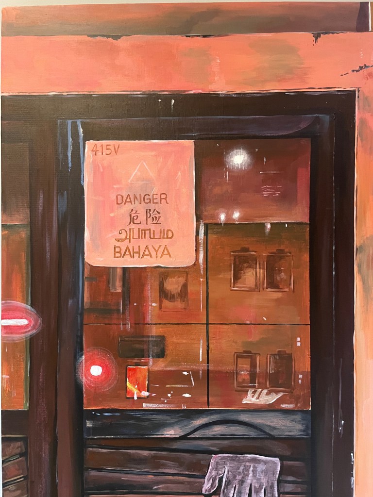 On the other side, a back alley is revealed. Two chairs and a small table awkwardly form a makeshift break room. The worker is framed by a rickety electrical box, his rubber boots are propped up to dry, and a glove hangs limp over a panel, with nothing to reach for.