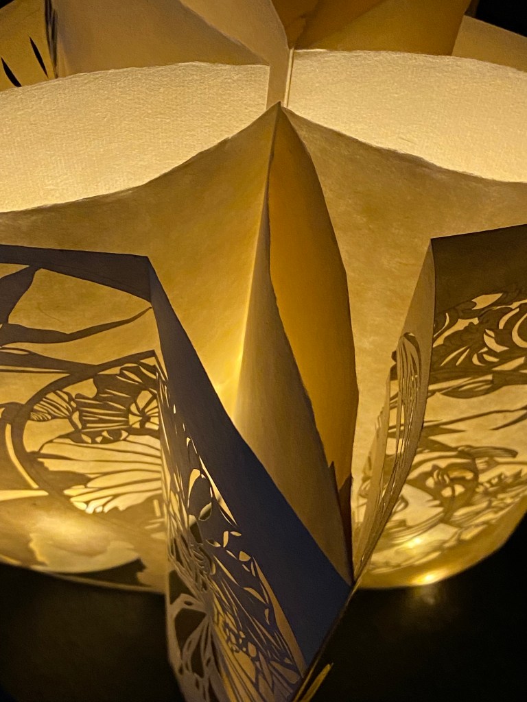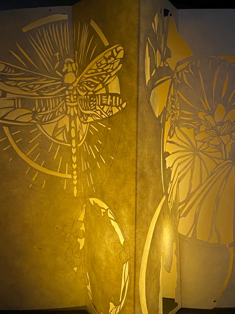 The artwork takes the form of a theatrical book that explores space through 3D illusionism and narrativity using layered stories that create perspective and depth.