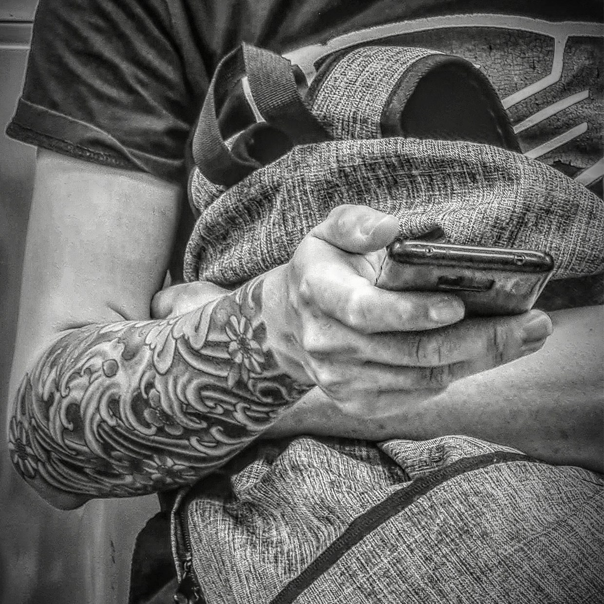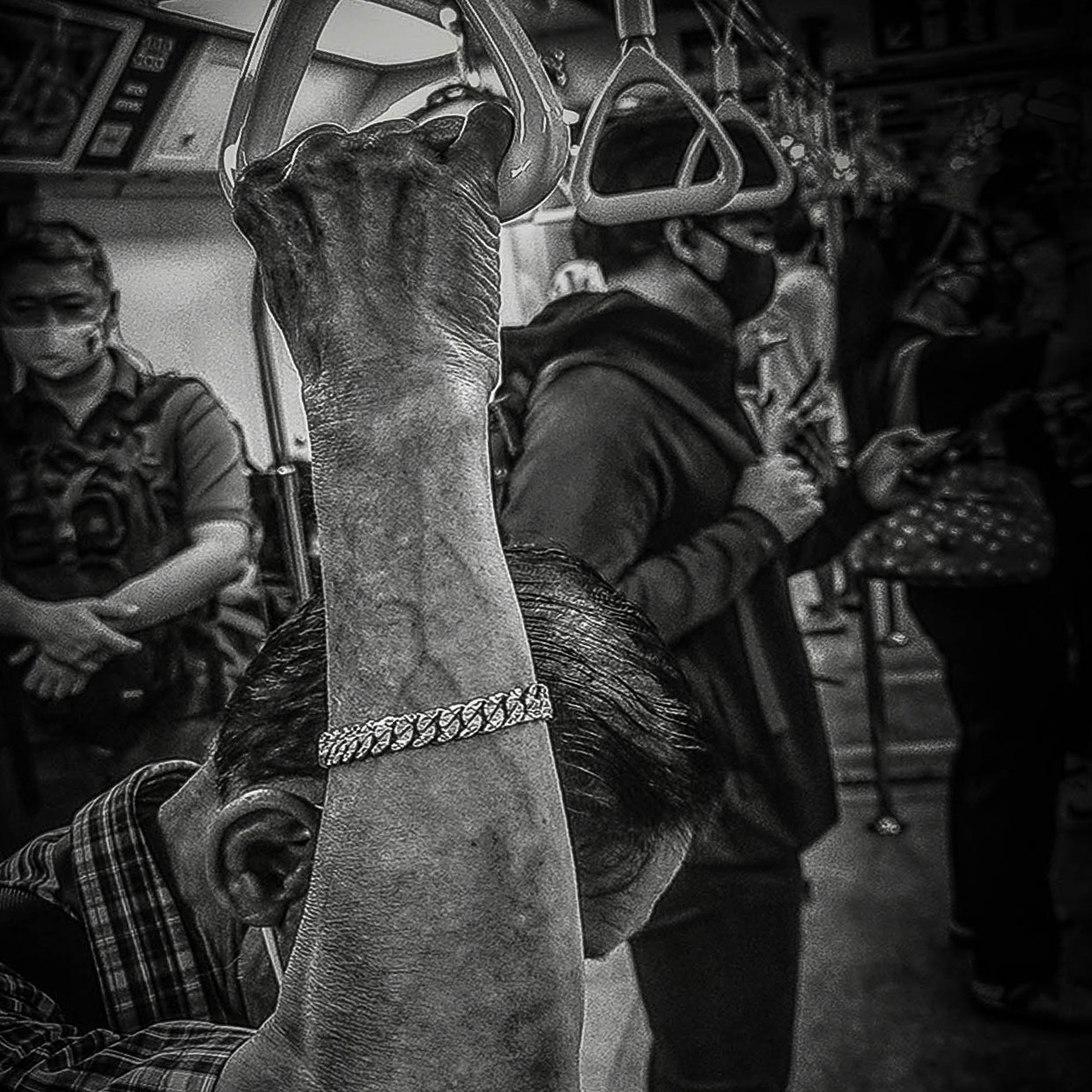 What began as a commute to work by train has led to a discovery and a new appreciation of personal space, for I observed a phenomenon of other commuters creating an “invisible bubble” around themselves by either engaging with their electronic gadgets or “tuning out” with their private thoughts. ‘Space’ can also be enforced by creating a physical barricade through gestures which may convey the impression that the person in question is not to be trifled with, and thus be best left alone. In this body of work, space is defined through the gestures of hands that convey human emotions. The hands have commonly been used in the various art forms to express human feelings. Here the frail hand holding onto the hand grip possibly be that of a tired man who has been working the whole day whilst a hand holding a bag of packed food suggests the urgent need to get home quickly to put food on the table for the family.
