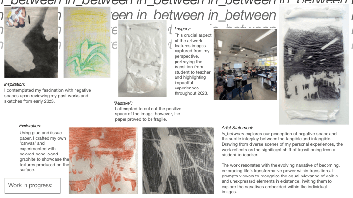 in_between explores our perception of negative space and the subtle interplay between the tangible and intangible. Drawing from diverse scenes of my personal experiences, the work reflects on the significant shift of transitioning from a student to a teacher.