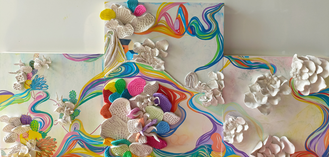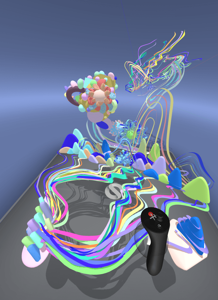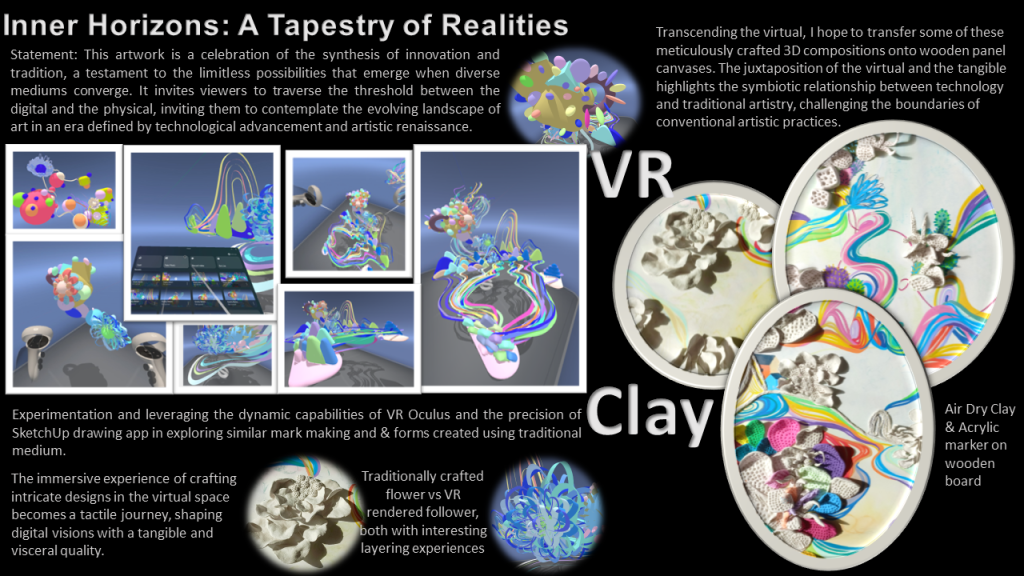 Inner Horizons: A Tapestry of Realities merges virtual reality and traditional mediums to transcend the boundaries of reality and imagination. It invites the viewers to explore their inner thoughts through a deepened self-reflection. The immersive journey delves into the complexities of self, challenging perceptions and unveiling hidden desires through mark-making in a conscious foreign space created through VR. By seamlessly merging the two worlds, the artwork becomes a transformative space, fostering a deeper understanding of the interconnectedness between reality and imagination.