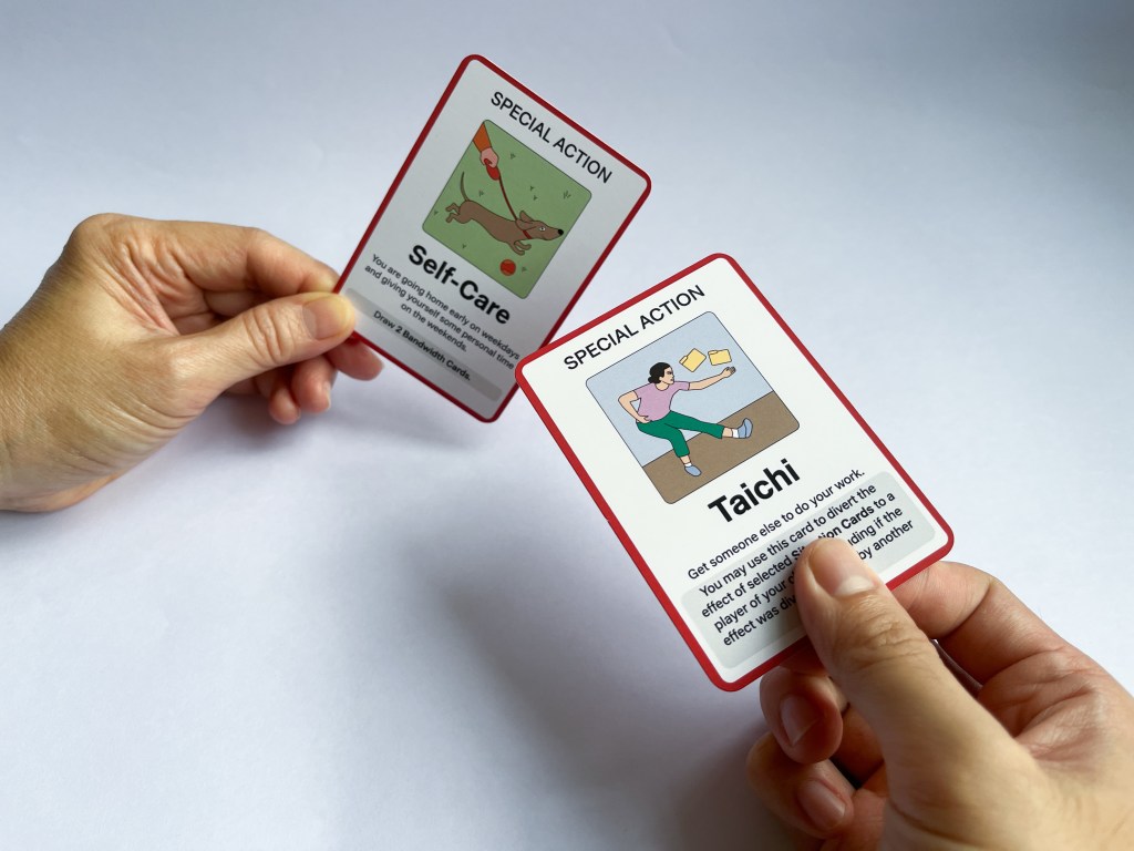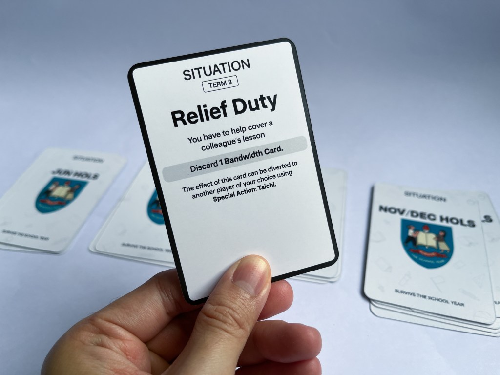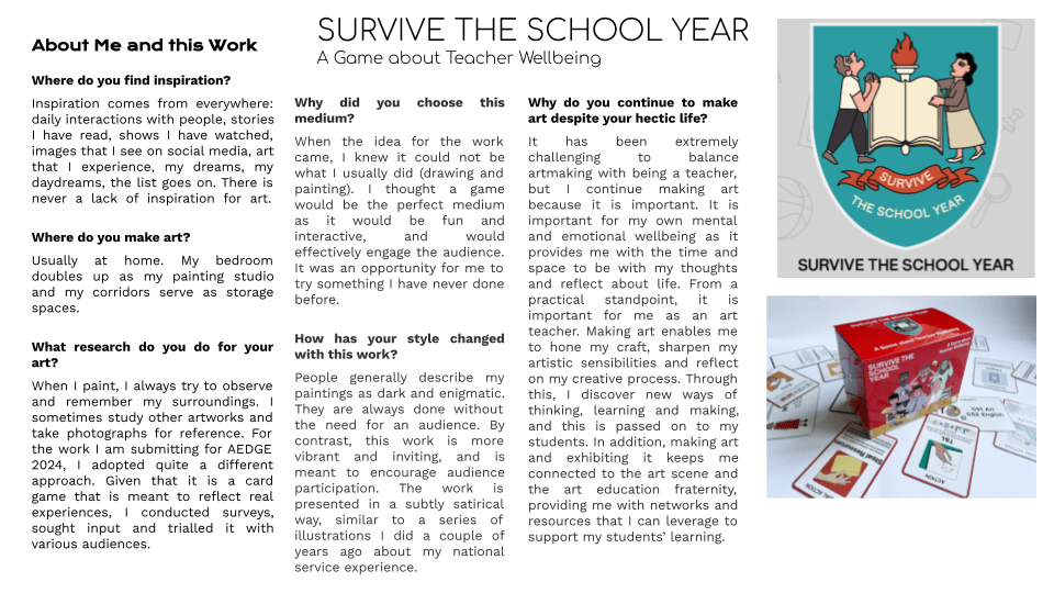Survive the School Year is a card game about teacher wellbeing in the context of Singapore schools. Players go through a typical school year as one of six teacher characters, navigating a variety of situations that can drain or increase their bandwidth. Employing a satirical approach, the game aims to raise awareness about the triumphs and challenges encountered by teachers and elicit resonance among teachers by drawing on their lived experiences. Implicitly, it encourages teachers to reflect on how collaborative efforts can safeguard collective well-being and maximise student outcomes.