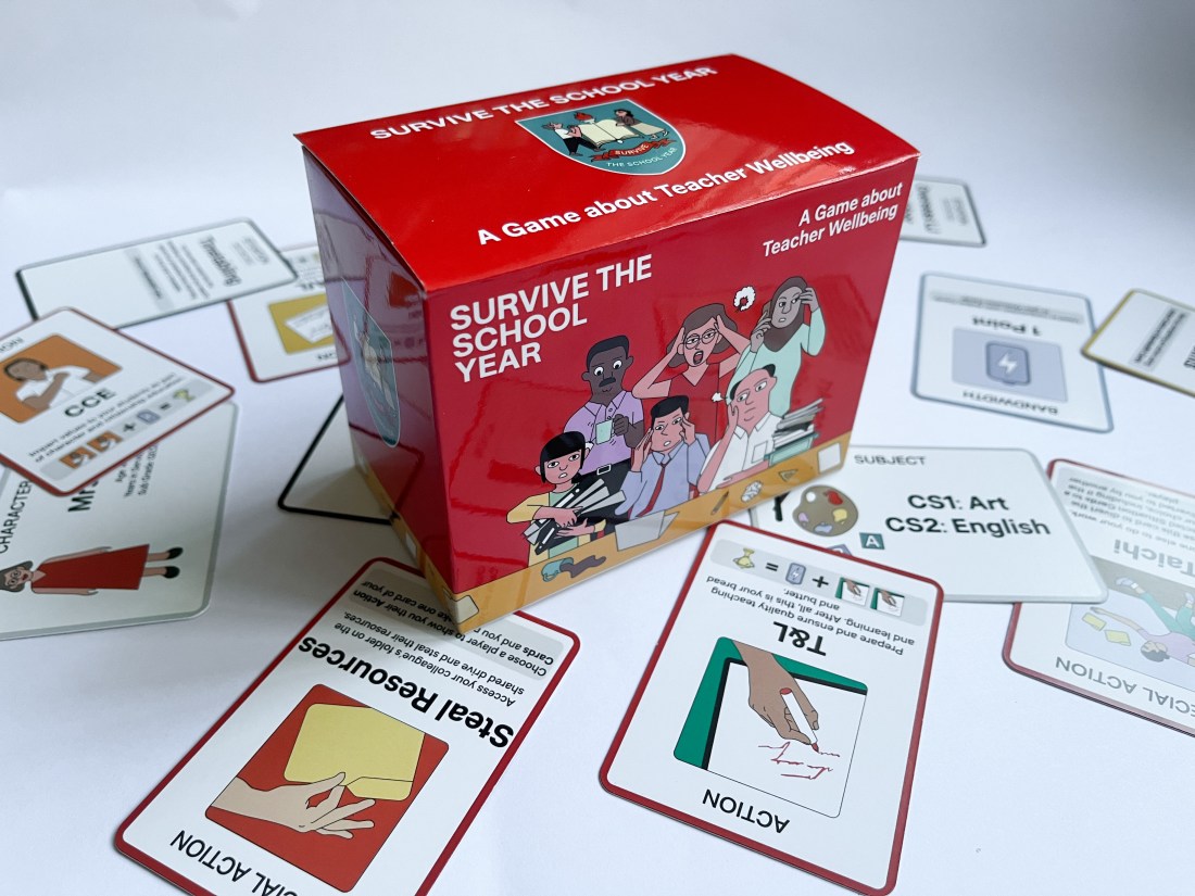 Survive the School Year is a card game about teacher wellbeing in the context of Singapore schools. Players go through a typical school year as one of six teacher characters, navigating a variety of situations that can drain or increase their bandwidth. Employing a satirical approach, the game aims to raise awareness about the triumphs and challenges encountered by teachers and elicit resonance among teachers by drawing on their lived experiences. Implicitly, it encourages teachers to reflect on how collaborative efforts can safeguard collective well-being and maximise student outcomes.