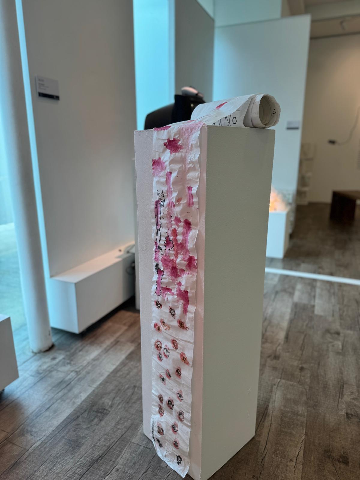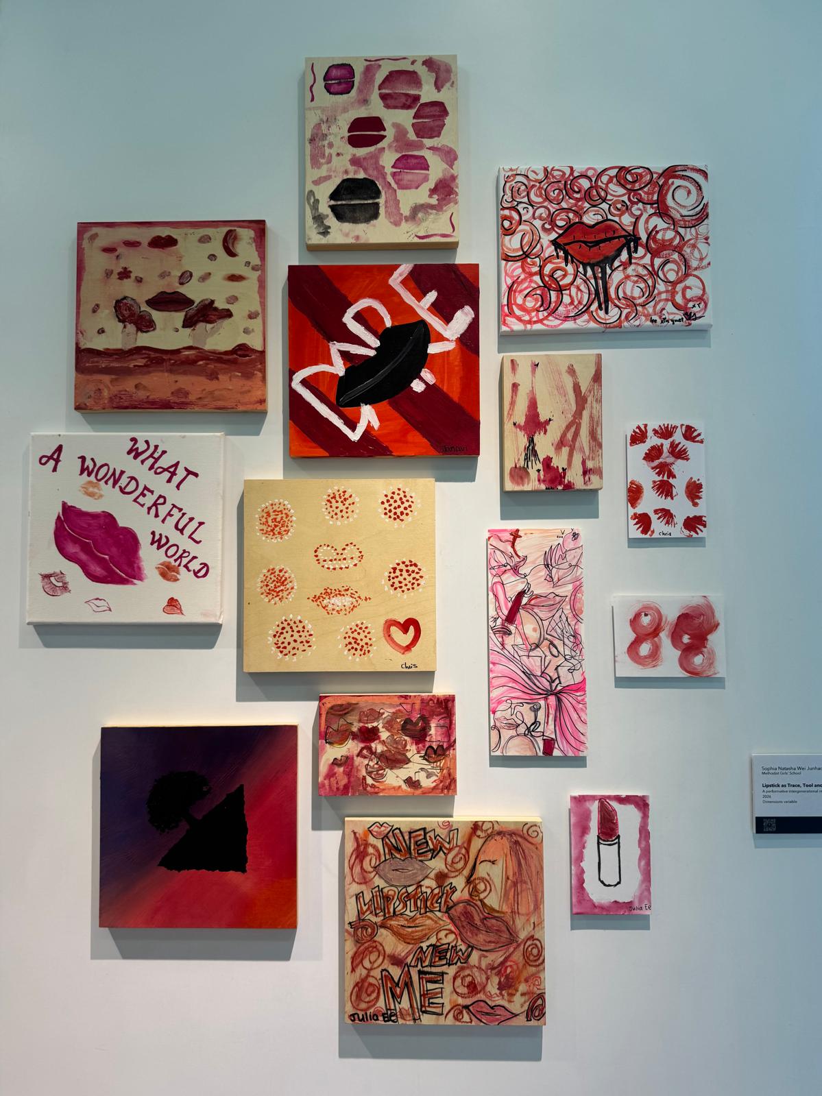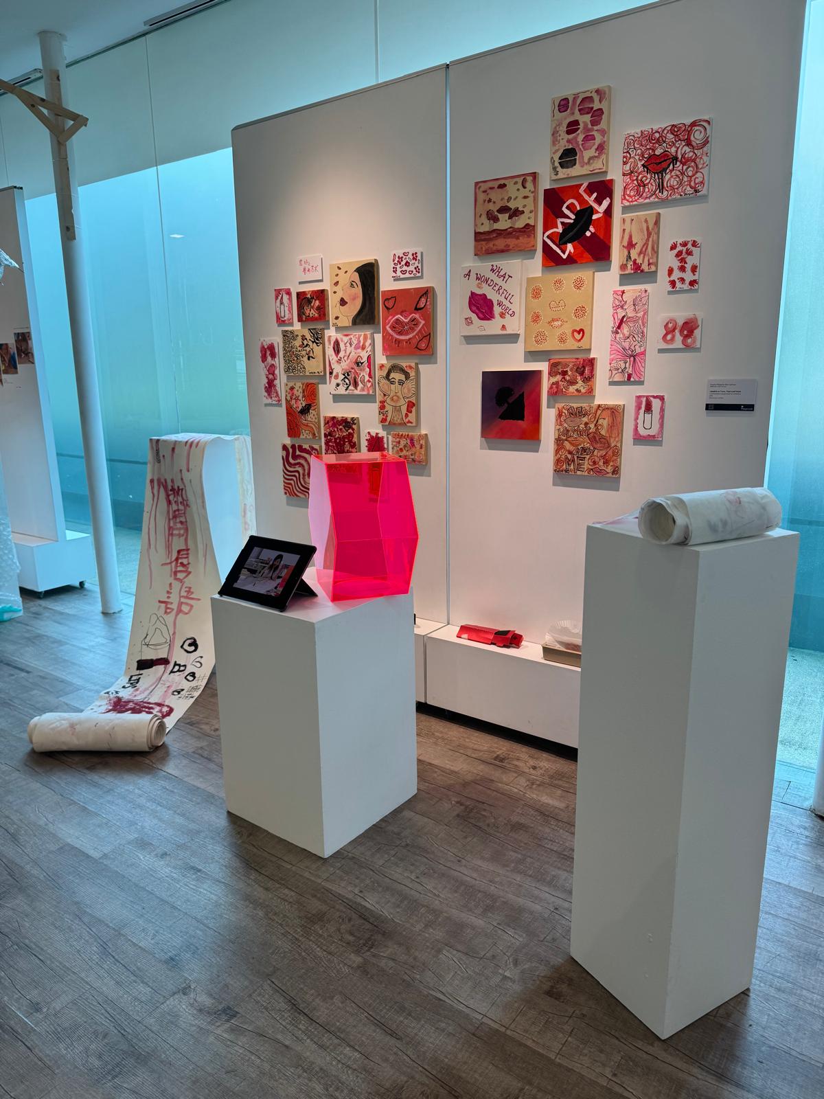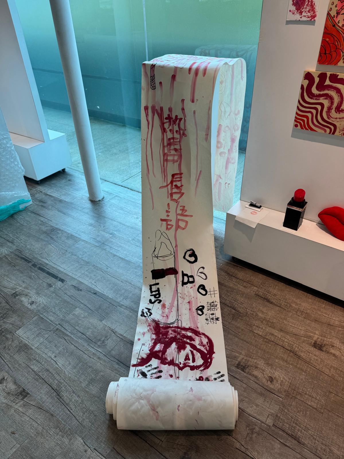 Accompanying objects, including soft lip sculptures and an enlarged lipstick form, extend the narrative beyond the live action, referencing consumption and aesthetics while questioning lipstick’s role in shaping perceptions of femininity. The work concludes by inviting participants to contribute their own marks, transforming the performance into a collaborative and evolving space of shared voices.