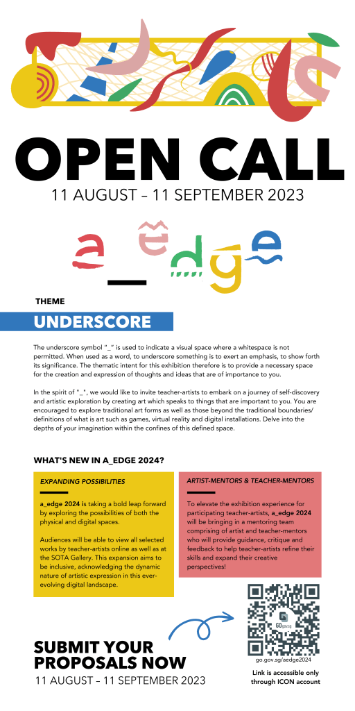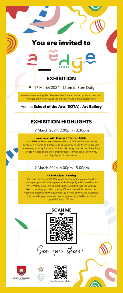 a_edge 2024 is the 12th edition of the annual art exhibition organised by the Singapore Teachers’ Academy for the aRts(STAR) to nurture the professional identity of art teachers as Teacher-artists. a_edge 2024 presents a total of 47 individual and collective works created by 66 Teacher-artists from schools and MOE HQ. This exhibition is made possible through the collaborative efforts of an organising team of art educators.
