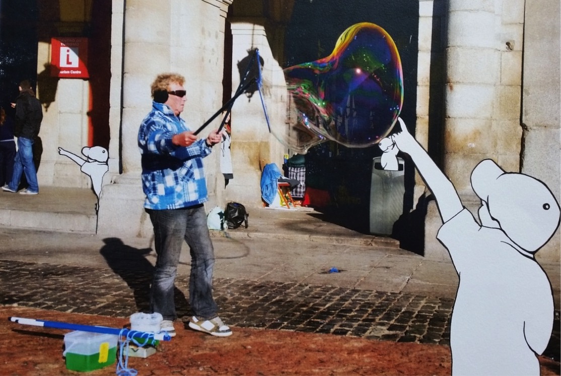 In addition to video works, there are several works of photography and digital illustrations included in a…edge. While the video works discussed gave breath to inanimate objects and nature’s elements, these photography works touch upon a sense of nostalgia, related to the past and themes of childhood. Wang Mo’s My world… is one such work that paints a dream-like dimension, as he falls down his own version of Alice’s rabbit hole. Mo animates the dreams he has, as he vacillates between the fine line that separates ‘reality’ and the dreamscape; in turn, he raises curiosity as to what is real and what other realms exist, defying logic and blurring the senses. The photographic element for him represents ‘reality’, while the illustrations with ink and paint are figments of his imagination. The illustrations venture beyond truthful perspectives and factual representation, as he plays with color and storytelling, inventing new characters and architectural elements. It is in the midst of fantasy that creativity comes alive and the artist’s inner world is exposed to the public world, encouraging our inner child and dreams to be unleashed and sought. The connection between what we perceive to be real and what seems to be in our minds is a subtle relationship that we negotiate and rationalize on a daily basis.